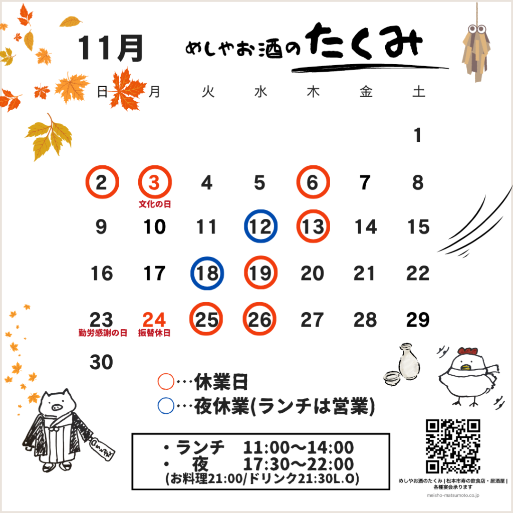 休業日・・・2(日)3(月)6(木)13(木)19(水)25(火)26(水)