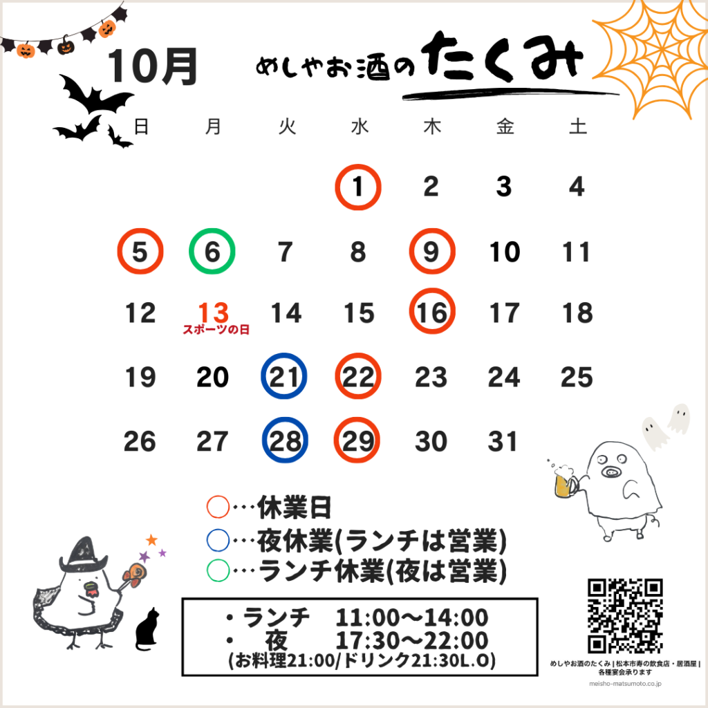 休業日・・・1(水)5(日)9(木)16(木)22(水)29(水)