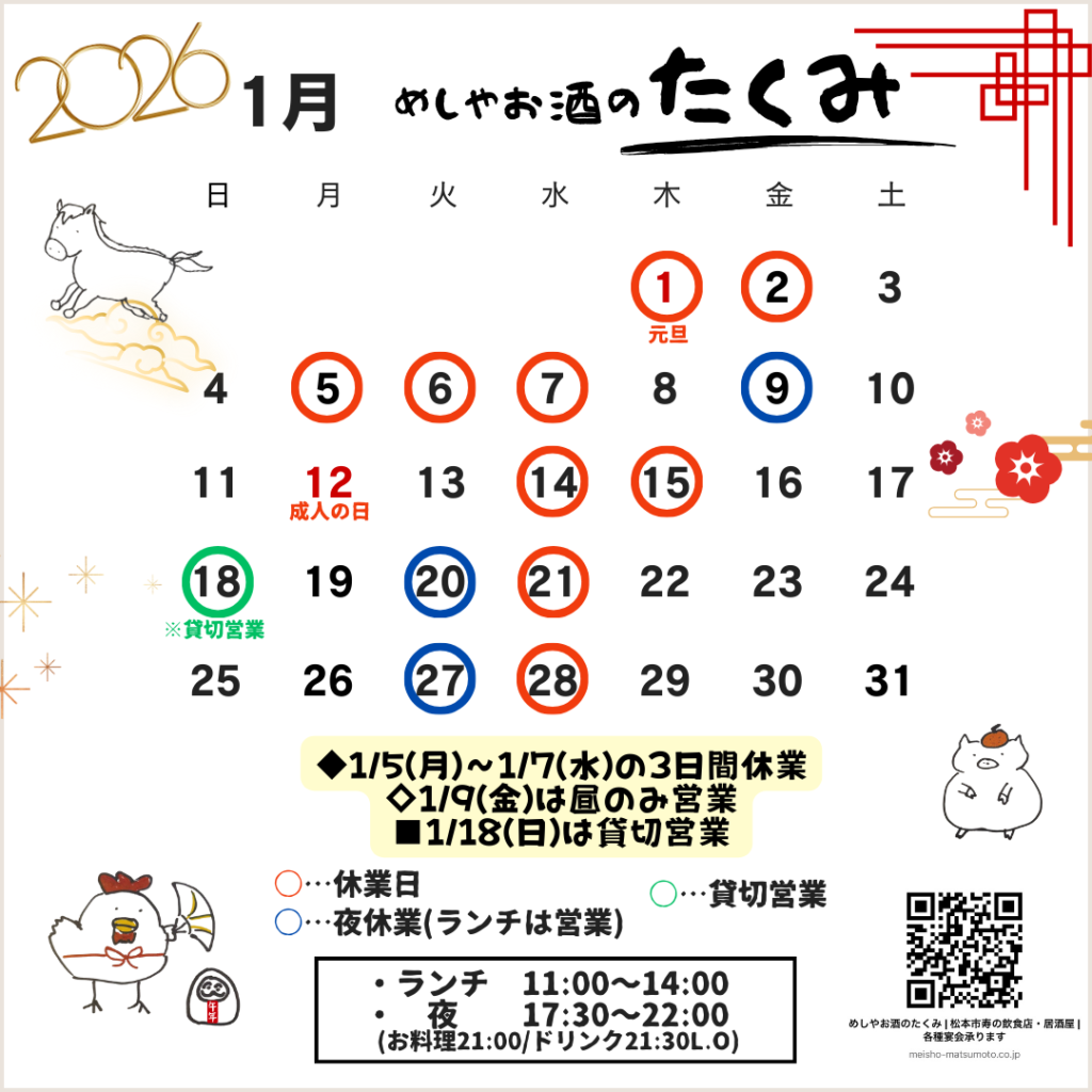 休業・・・1(木)2(金)5(月)6(火)7(水)14(水)15(木)21(水)28(水)